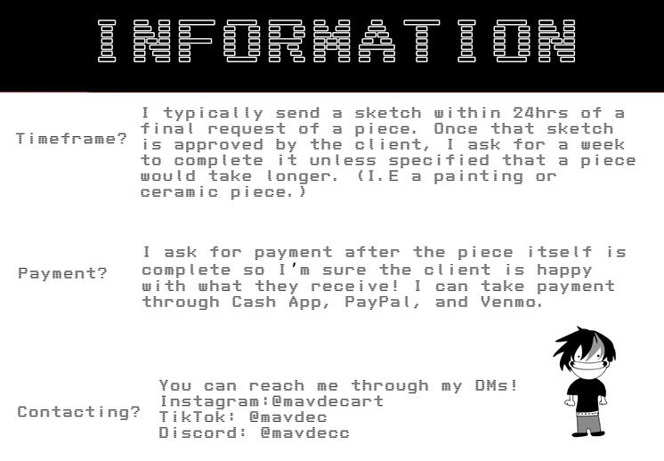 You can contact me through my DMs! Find me on Instagram @mavdecart, TikTok @mavdec, and discord @mavdecc !